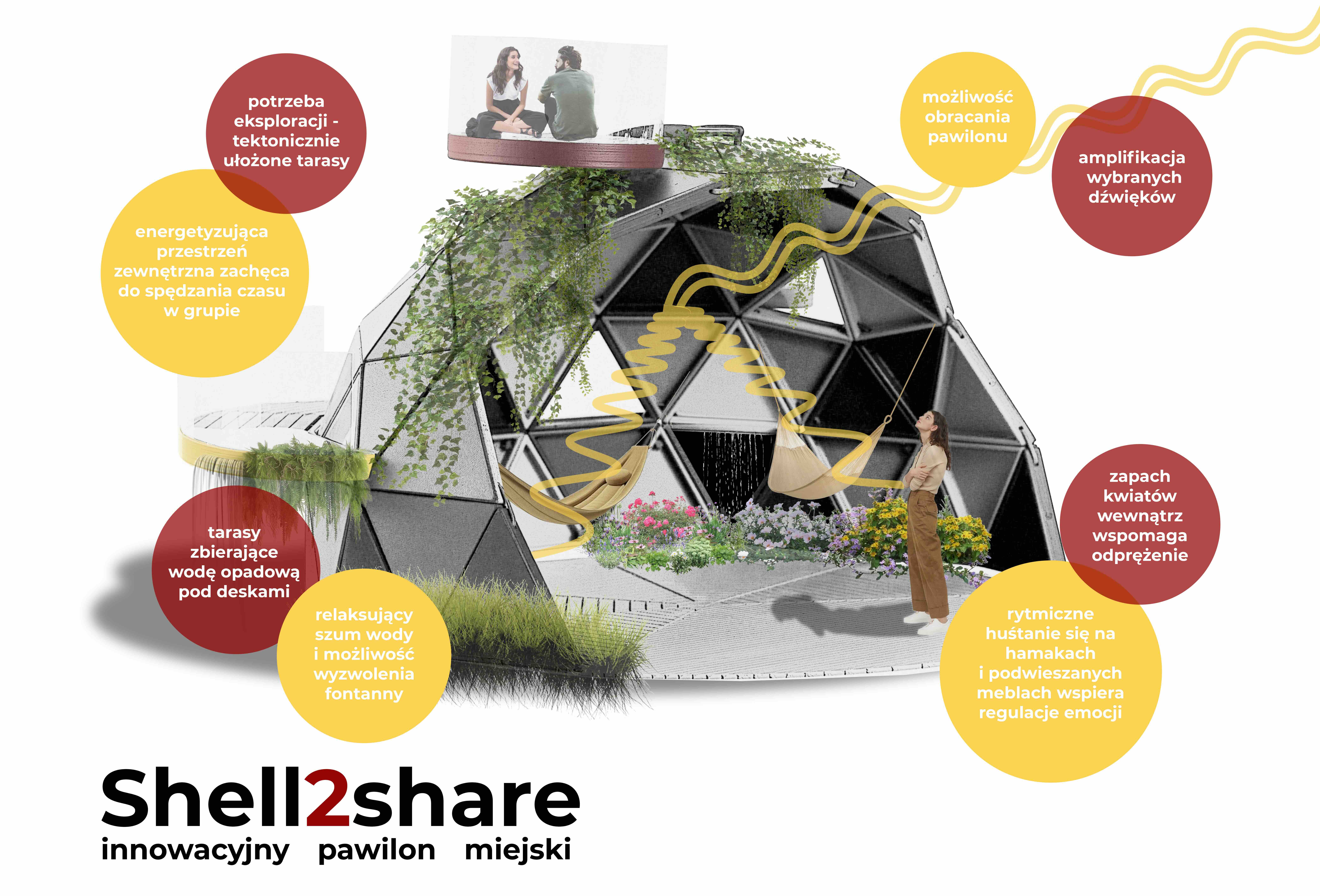 Shell2share to forma łącząca w sobie pawilon z meblem miejskim. Jest to struktura na planie koła przyjmująca formę muszli. Pawilon pełni podwójną funkcję – w środku kopuły możemy odnaleźć wytchnienie relaksując się w podwieszanych siedziskach, a zewnętrzne tarasy przeznaczone są do spędzania czasu w grupie. Dwoisty charakter przestrzeni podkreślony jest poprzez użyte kolory – relaksujące w środku oraz energetyzujące z zewnątrz. Kształt pawilonu sprawia, że wewnątrz możliwe jest wybiórcze amplifikowanie interesujących dźwięków otoczenia. Brzmienia te można zmieniać poprzez obracanie kopuły i nakierowywanie jej w odpowiednie miejsce. Zewnętrzne tarasy pełnią również funkcję zbiorników wodnych. Pod deskami gromadzi się woda opadowa, którą później użytkownicy mogą wyzwolić, by podlać obrastające kopułę kwiaty.